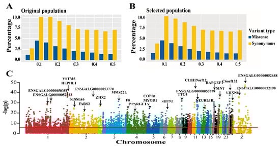 Analysis of allele spectrum and frequency difference of missense and synonymous SNPs. (A,B) Minor allele frequency spectrum of missense and synonymous SNPs in original and selected population. (C) Manhattan plot of frequency difference of missense variants between two lines, the y-axis represents the p value in log scale, which calculated by Fisher’s exact test, the x-axis represents the physical position of missense SNPs in each chromosome.