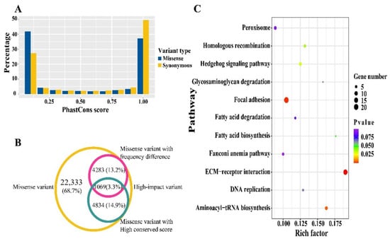Conservation analysis, annotation and enrichment analysis for high-impact variants. (A) Ratio of variants with various conservation score. (B) Overlapping of different types of missense variants, the missense variants with frequency difference and high conserved score were defined as the high-impact SNPs. (C) KEGG pathways enriched by genes harboring high-impact SNPs.