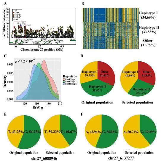Haplotype association analysis and frequency difference in original and selected populations. (A) A refined genomic region was identified by r2 > 0.8 and 2-LOD drop-off method, namely the pink box. (B) Distribution of two major haplotypes (I and II) in JX chicken. (C) The effect of major haplotypes on BrW, the haplotype I has an increasing effect on BrW. (D) The frequency of two major haplotype (I and II) in original and selected population. (E,F) The frequency of two conserved sites (chr27_6088946 and chr27_6137277) in original and selected population.