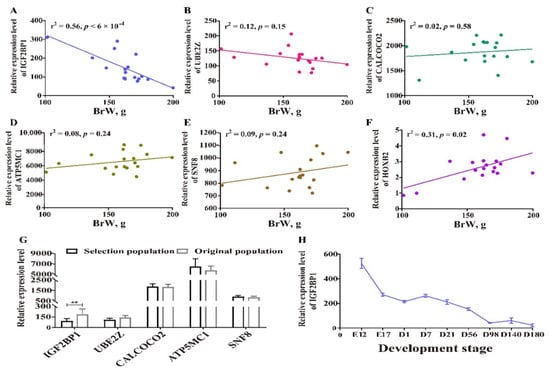 Transcriptomic analysis for candidate genes. (A–E) Correlation analysis between BrW and genes IGF2BP1, UBE2Z, CALCOCO2, ATP5MC1, and SNF8, respectively. (F) Comparison for BrW from the individuals performing the RNA-seq (n = 9 each population). (G) Differentially expressed genes analysis for IGF2BP1, UBE2Z, CALCOCO2, ATP5MC1, and SNF8 between two lines, ** indicates p < 0.01. (H) Stage-based expression pattern of IGF2BP1, E indicates embryo stage, D indicates the age of after hatching.