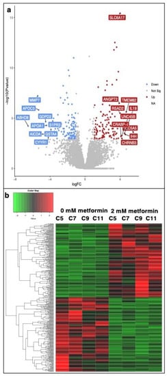 RNASeq analysis of mRNA extracted from metformin-treated COVCAR cells. COVCAR cell lines (C5, C7, C9, C11) were treated with 0, 0.5, 1, or 2 mM metformin for 24 h in ultra-low attachment culture wells. Total RNA was extracted and subjected to RNA sequencing Illumina sequencing. Statistical analysis was performed using DESeq2 in R v.4.1.0. to identify the differentially expressed genes (DEGs). (a) Volcano plot to indicate the differentially expressed genes (DEGs). Colored for |log2FC| > 1 and FDR < 0.05. (b) Heatmap of hierarchically clustered 365 DEGs between 0- and 2-mM metformin-treated COVCAR cells.