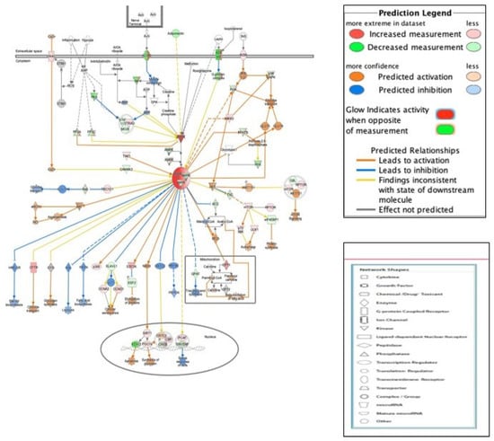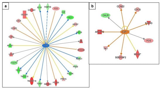 The TP53 gene is one of the primary molecules involved in apoptosis and DNA-damage-repair pathways in cells. Greater than 50% of all ovarian cancer is associated with mutations in the TP53 gene []. IPA predicted the inhibition of TP53 (z-score −2.018, overlap p = 1.53 ), and 16 of 27 genes have measurement and direction consistent with inhibition of TP53 (Figure 7, Supplementary Table S5). Another transcription factor, E2F transcription factor 1 (E2F1), which plays a role in TP53-mediated apoptosis cell cycle progression, and cell proliferation, is predicted to be activated (z-score 1.720, overlap p = 3.92 ), and six of the eight genes have measurement and direction consistent with activation of E2F1 (Figure 7). A detailed association between upregulated molecules in the dataset and E2F1 is provided in Supplementary Table S6.