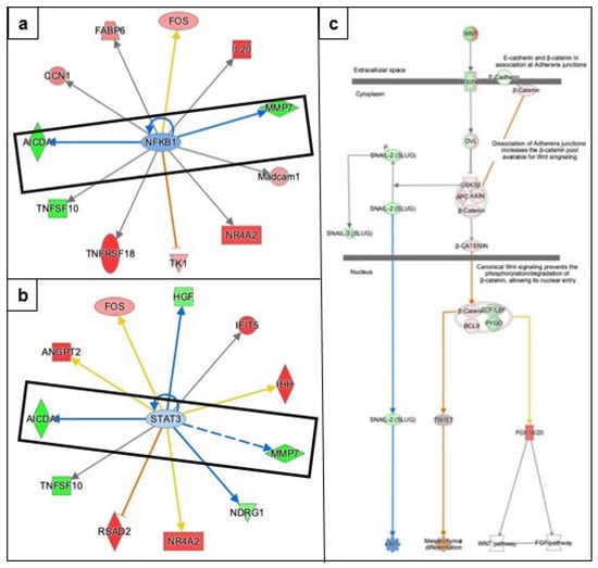 Effect of metformin on epithelial–mesenchymal transition predicted by IPA. Up-stream analysis in IPA predicts the activation/inhibition of various transcription factors. (a,b) Transcription factors involved in EMT, NFKB, and STAT3 are predicted to be inhibited due to the downregulation of MMP7 and AICDA. (c) Canonical WNT signaling pathway involved in EMT was overlaid with dataset molecules that lead to a predicted inhibition of EMT acting downregulation of SNAIl-2 (SLUG). The key for the shape, color, direction, and molecule types in the above pathways is provided in Figure 4.