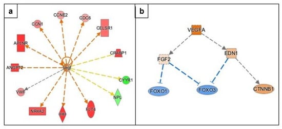 Effect of metformin on angiogenesis as predicted by IPA. (a) Transcription factor VEGF involved in angiogenesis is predicted to be activated through the upregulation of molecules in the dataset. (b) VEGFA network, the top mechanistic network to be activated acting through FGF2, EDN1, FOXO1, FOXO3, and CTNNB1 regulators. The key for the shape, color, direction and molecule types in the above pathways is provided in Figure 4.