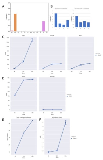 RNA editing and expression of key genes in total RNAseq data from Calu-3 infected cells at three time points post-infection (4 h, 12 h, and 24 h). (A) Distribution of hyper-edited reads identified in infected Calu-3 cells in which A-to-G and T-to-C events appear prominent. (B) Nucleotide context one nucleotide upstream and downstream the detected hyper-edited sites. (C) Gene expression of type-I interferon (IFNB1) and key sensor genes, DDX58 (RIG-I) and IFIH1 (MDA5), in infected Calu-3 cells. Here, we report only IFNB1 as main interferon gene modulated upon infection. As expected, DDX58 and IFIH1 increase their expression during the infection. Gene expression of type-I interferons, RIG-I and TLR receptors, and APOBECs are reported in the Supplementary Figure S1A. (D) Expression of ADAR1 (ADAR) and ADAR2 (ADARB1) genes in infected Calu-3 cells. While ADAR2 is expressed at extremely low levels and does not change during the infection, ADAR1 is positively modulated and its expression increases significantly (DESeq2 adjusted p-value < 0.05) from 4 to 12 h post-infection. (E) Enrichment of unique hyper editing positions in infected Calu-3 cells. (F) Alu editing index (AEI) in infected Calu-3 cells. It is a reliable score to measure the ADAR activity at the transcriptome level and tends to grow with the increase in ADAR expression. Dotted lines and bars on each dot indicate mean gene expression or AEI ± SD.
