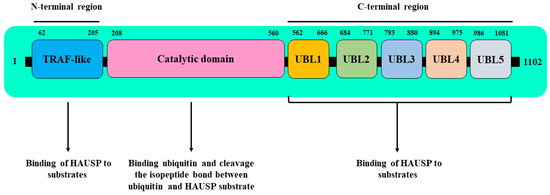 Schematic representation of the domain structure of HAUSP (herpes virus-associated ubiquitin-specific protease). The structure of HAUSP includes seven domains, N-terminal TRAF-like (Tumor necrosis factor Receptor–Associated Factor) domain, intermediate catalytic core and five consecutive C-terminal ubiquitin-like domains (Ubiquitin-like domains), UBL1-5. The N-terminal TRAF-like domain and the five UBL domains are sites for the binding of HAUSP to many proteins. Through the catalytic core domain, HAUSP binds ubiquitin and cleave the is peptide bond between ubiquitin and HAUSP substrate [17,18,31].