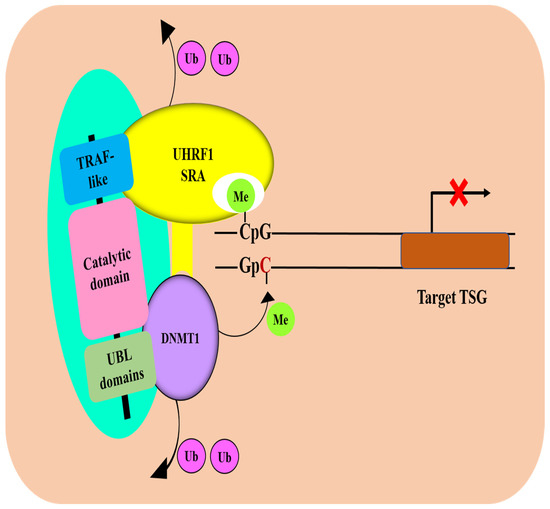 One of the well-documented epigenetic regulators of the DNA methylation maintenance machinery is the epigenetic reader UHRF1, which has multiple functional domains [65,66,67]. Through its SRA domain, UHRF1 recognizes and binds hemi-methylated CpG islands, and via the same SRA domain, UHRF1 recruits DNMT1 to its correct position on chromatin to ensure faithful transmission of DNA methylation patterns during DNA replication [68,69,70]. Besides its interaction with DNMT1, UHRF1 also interacts directly with other epigenetic writers, such as G9a [71] and TIP60 [36,72,73], and epigenetic erasers, including HDAC1) [74] and HAUSP [36,38,75] to form a macromolecular complex. In this complex, the deubiquitinase HAUSP can function as a hub protein through its direct interaction with UHRF1, which leads to its deubiquitination protecting UHRF1 from proteasomal degradation, thereby allowing UHRF1 to read epigenetic marks and to recruit and guide the right enzyme, writer, or eraser to the correct position at the right time to catalyze the target epigenetic mark [39,45,75,76,77]. In this way, UHRF1 ensures a faithful inheritance of both types of epigenetic marks (DNA methylation and histone PTMs) to daughter cells and leads to the epigenetic silencing of several TSGs, such as p16INK4A, PTEN, BRCA1, and hMLH1 [32,78].