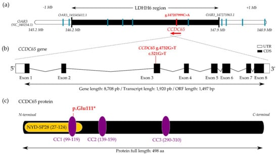 Nonsense variant in CCDC65 gene associated with the LDHH6 lethal haplotype. (a) LDHH6 haplotype (NC_040254.1:OAR3:146,243,481pb-147,946,399pb) extended by 1 Mb from each side. The black bar indicates the limits of LDHH6 haplotype with the first and last markers (Illumina OvineSNP50 OAR3_145545612.1 and OAR3_147275963.1). Vertical lines indicate the positions of the candidate causal SNV in CCDC65 (red) and 10 other SNVs fully associated with LDHH6 (blue); (b) CCDC65 gene structure and localization of the g.4732G > T (GeneID:101104220)/c.521G > T (XM_004006389.4) variant in the third exon (UTR: untranslated region, CDS: coding sequence); (c) schematic representation of CCDC65 protein (XP_004006438.1) with one N-terminal ‘NYD-SP28’ (Pfam PF14772) and three coiled-coil (CC) domains (UniProtKB-W5QCQ9), and position of the premature C-terminal residue, pGlu111.