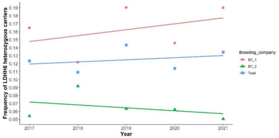 Since 2017, all Lacaune male lamb candidates for genomic selection were genotyped on low-density sheep (SheepLD chip) between one and five months of age, with a good representation of the genetic diversity in the selection schemes. In the Lacaune dairy breed, the population consists of two subpopulations with separate selection schemes conducted by two breeding companies. Overall, LDHH6 heterozygous carrier frequency observed is stable in the population between 2017 and 2021. Nevertheless, the frequency of carriers was two-fold higher for breeding company 1 compared to breeding company 2 (Figure 2).