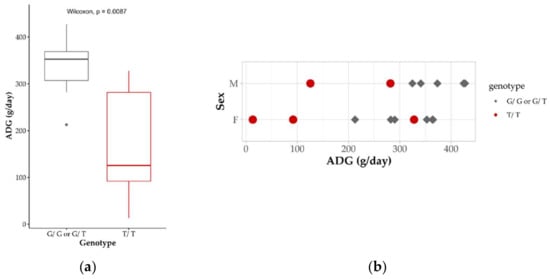 The genotyping of the CCDC65 variant in two experimental flocks of dairy Lacaune ewes (n = 245) enabled us to identify 17 heterozygous carriers. These ewes were inseminated with fresh semen from heterozygous carrier rams to generate at-risk matings. Forty-five days after AI, 11 ewes were diagnosed as pregnant by ultrasonography. This corresponded to an AI success of 65%, in line with the average AI success of 69% recorded in the whole dairy Lacaune population [28]. Gestation length was recorded as normal (146 ± 2 days), and no abortion or stillborn was observed. At the end of gestation, 16 lambs were born with 7 males and 9 females. For each lamb, an ear punch was collected for genotyping of the c.521G > T CCDC65 variant. Five lambs were genotyped homozygous non-carriers, 6 were heterozygous and 5 were homozygous carriers, consistent with the Hardy–Weinberg equilibrium (Chi-square test, p = 0.317). All lambs were weighted at birth (males: 4.9 ± 1.0 kg, females: 3.9 ± 0.6 kg), and no significant difference of birthweight was observed between genotypes. A second weighing was carried out at day 15 and average daily gain (ADG) was calculated on the 0–15 day period. Based on Wilcoxon’s non-parametric test, the homozygous carrier (T/T) showed a significant lower ADG compared to the other lambs (G/G or G/T) (Figure 3).