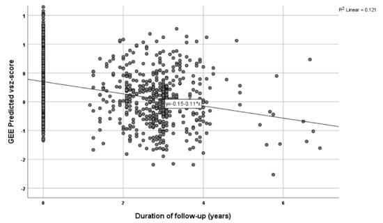 Graphic illustration of the cognitive decline in visuo-spatial ability over time (covariates are included).