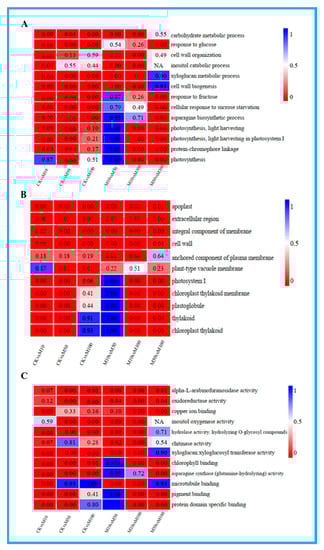 GO-terms enrichment analysis. From the red to blue corresponds to the numerical value of corrected Q and significant enriched GO-terms from the low to the high. (A) biological process; (B) cellular component; (C) molecular function.