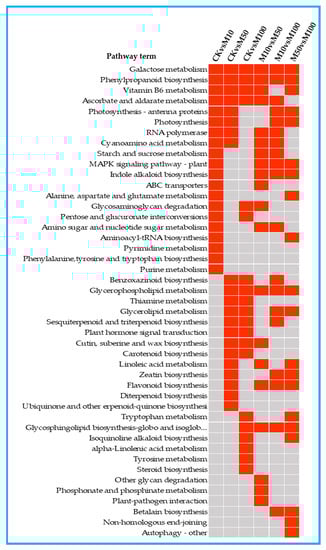 The first 20 enrichment pathways of the three combinations (CKvsM10, CKvsM50, CKvsM100) were compared and analyzed (Figure 4). Galactose metabolism, phenylpropanoid biosynthesis, vitamin B6 metabolism, ascorbate and aldarate metabolism were enriched in the three comparisons among the top 20 pathways (Figure 4). This indicated that these pathways differed significantly under different MeJA concentrations treatments. Some pathways were enriched in the top 20 in two combinations, photosynthesis-antenna proteins, photosynthesis and RNA polymerase were enriched in the top 20 in CKvsM10 and CKvsM50 (Figure 4). This indicated that these pathways might play important roles in responding to 10 and 50 μM MeJA treatments. Glycosaminoglycan degradation and pentose and glucuronate interconversions were enriched in the top 20 in CKvsM10 and CKvsM100 (Figure 4), suggesting that 10 and 100 μM MeJA were more effective for them. Benzoxazinoid biosynthesis, sesquiterpenoid and triterpenoid biosynthesis, plant hormone signal transduction and carotenoid biosynthesis were enriched in the top 20 in CKvsM50 and CKvsM100 (Figure 4), suggesting that 50 and 100 μM MeJA were more effective for these pathways. Some pathways were only enriched in the top 20 for one combination (Figure 4). MAPK signaling pathway-plant, indole alkaloid biosynthesis, ABC transporters, and phenylalanine, tyrosine and tryptophan biosynthesis were only enriched in the top 20 in CKvsM10. Linoleic acid metabolism, zeatin biosynthesis, flavonoid biosynthesis, diterpenoid biosynthesis and ubiquinone and other terpenoid-quinone biosynthesis were only enriched in the top 20 in CKvsM50. Tryptophan metabolism, isoquinoline alkaloid biosynthesis, alpha-Linolenic acid metabolism, tyrosine metabolism and steroid biosynthesis were only enriched in the top 20 in CKvsM100, indicating that 50 and 100 μM MeJA were more effective than 10 μM MeJA for metabolites such as terpenoids and flavonoids.