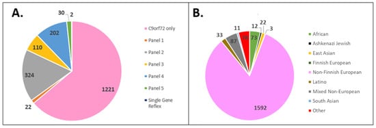 This study was deemed exempt from review by The Ohio State University Institutional Review Board (IRB) in Columbus, Ohio. A retrospective review of a commercial laboratory testing database was performed to identify a cohort dataset consisting of all patients who underwent ALS-FTD genetic testing at the Prevention Genetics Laboratory from 2013 to 2020. The cohort included representation from both the USA and Canada with samples received from multiple different national ALS-FTD centers and Canadian provinces. This dataset included 1911 individuals of diverse REA between the ages of 8 and 96 years old who underwent C9orf72 HRE analysis exclusively or C9orf72 HRE analysis with reflex to multigene-panel or single-gene analysis (Table 1, Figure 1A). C9orf72 repeat expansions were analyzed using two custom repeat primed PCR assays for both the 3′ and 5′ ends of the HRE. C9orf72 repeats of ≥ 30 were considered pathogenic, 25–29 considered intermediate and of uncertain clinical significance, and < 25 repeats normal. For patients tested via panel testing, C9orf72 repeat expansion testing was performed first, and if negative, reflexive panel testing via next-generation sequencing was conducted. Sequencing was performed using Illumina NovaSeq 6000 (Illumina, San Diego, CA, USA) and reads were aligned to a reference sequencing (hg19). All variants were interpreted per the American College of Medical Genetics variant classification guidelines, and only uncertain, likely pathogenic, and pathogenic variants were reported [37].