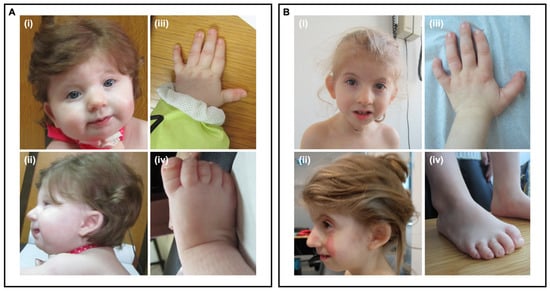 Craniofacial, hand and foot dysmorphisms at nine months old (A) and five years and seven months (B). (i)—Facial dysmorphic features: broad nasal bridge and thin upper lip. (ii)—Micrognathia, low-set, posteriorly rotated, dysmorphic ears. (iii)—Short 5th metacarpal. (iv)—Broad hallux and hypoplastic nails of the fifth toes.