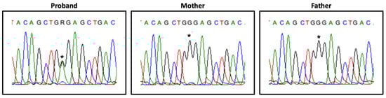 Exome Sequencing (ES) analysis was performed on proband’s genomic DNA (gDNA), obtained from peripheral blood, using salting out methods [13]. Libraries were captured using a SureSelect V5-post Kit (Agilent Technologies, Santa Clara, CA, USA), and 100 bp paired-end sequencing was performed using an Illumina HiSeq 2000/2500 (Illumina, San Diego, CA, USA). The Genome Analysis Toolkit (GATK v3.4.0) was used to assemble the raw data of FASTQ file format into the University of California Santa Cruz (UCSC) Genome Browser (Available online: http://genome.uscs.edu/ (accessed on 10 February 2016))—human assembly: February 2009 (hg19—NCBI build GRCh37) and variant alleles were annotated using SnpEff (SnpEff_v4.1 g).