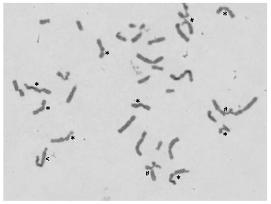 Example of metaphase spread showing chromosome abnormalities. Metaphase from proband’s lymphocyte culture, after treatment with 0.10 µg/mL of DEB, observed under the 100X objective, showing chromosome breaks (*), radial figures (#) and a dicentric chromosome (<).
