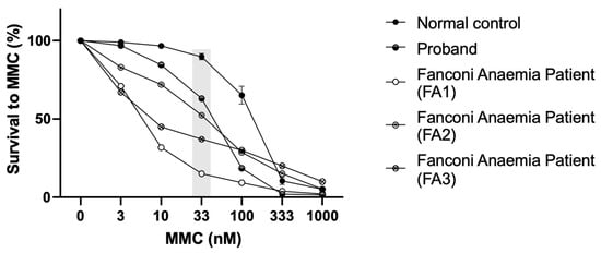 Mitomycin C sensitivity test. MMC sensitivity of the LCLs from the proband and controls (normal control, i.e., healthy donor, and three positive controls, i.e., Fanconi anaemia patients—FA1; FA2; FA3). The differential concentration (33 nM) is highlighted in grey.