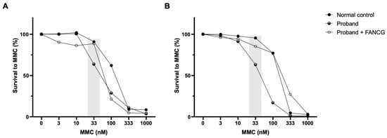 Complementation studies. Genetic complementation of the proband’s LCLs with a retroviral vector expressing a functional FANCG protein (LGEG11). Two different and independent experiments are shown (A,B). A reversion in the MMC hypersensitivity of the proband’s LCLs after retroviral-mediated gene transfer was observed. The differential concentration (33 nM) is highlighted in grey.