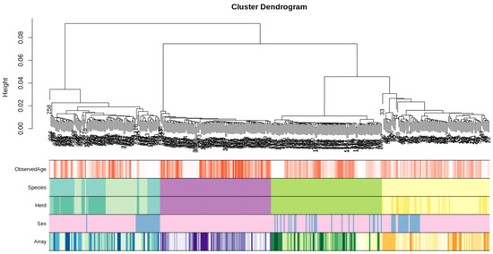Hierarchical clustering of the samples for each species was performed with the R package WGCNA [24] to establish if there was any underlying structure in the datasets that could be attributed to the known covariates, including array batch effects or breed variation. Six sheep samples were excluded by quality control measures due to suspected contamination when their sex check results were nonconclusive, i.e., the samples clustered more closely with samples of the opposite sex to their recorded sex.