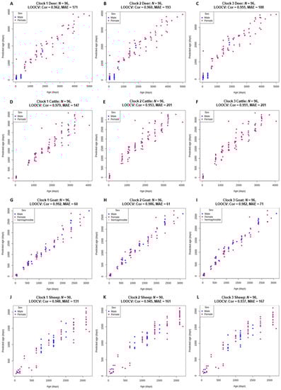Chronological age (x-axis) versus back transformed epigenetic age estimated using clock 1 (log transformed chronological age; (A,D,G,J)), clock 2 (loglogRelativeAge; (B,E,H,K)) and clock 3 (log-linear transformed age; (C,F,I,L)). For all four species, deer (A–C), cattle, (D–F), goat (G–I) and sheep (J–L). Pearson’s correlation coefficient estimates (Cor) and median absolute error (MAE) are reported for the age estimates via LOOCV.
