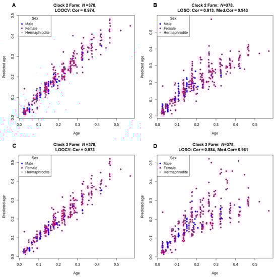 Relative age (x-axis) versus back-transformed relative epigenetic age estimated for Farm clock 2 (loglogRelativeAge; (A,B)) and Farm clock 3 (log-linear transformed age; (C,D)). Age estimates were predicted via both LOOCV (A,C) and LOSO (B,D) cross-validation. The Pearson correlation coefficients (Cor) are reported for the age estimates using both LOOCV and LOSO cross-validation and the median correlation coefficients (Med.Cor) for each fold of the LOSO cross-validation are reported.