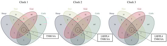 Venn diagrams depicting the overlap of CpG sites included in each of the individual species’ clocks for clock 1, clock 2 and clock 3. The CpG sites common across all four species lie within the genes TNRC6A and LHFPL4.