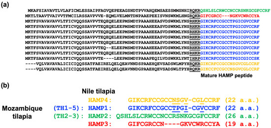 - Huang, P.-H.; Chen, J.-Y.; Kuo, C.-M. Three different hepcidins from tilapia, Oreochromis mossambicus: Analysis of their expressions and biological functions. Mol. Immunol. 2007, 44, 1922–1934. [Google Scholar] [CrossRef] [PubMed]