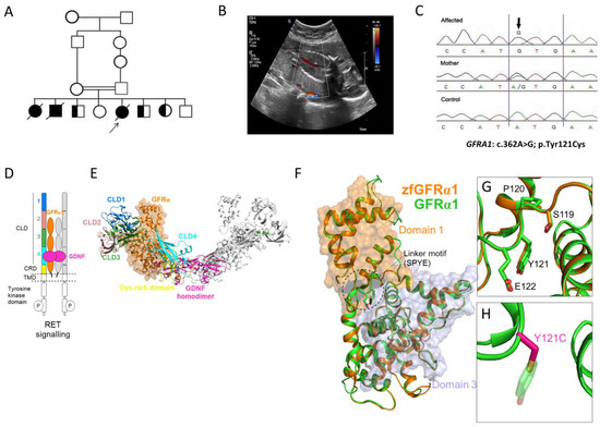 A consanguineous family who had lost three pregnancies with three neonatal deaths due to BRA and five healthy children was investigated (Figure 1). The family history confirmed healthy parents and a neonatal death in the first, second, and fifth pregnancies. This is consistent with an autosomal recessive cause of disease in this family. In the fifth pregnancy, fetal antenatal ultrasound indicated BRA and anhydramnios at 20 weeks’ gestation. Cordocentesis was performed to obtain fetal DNA for the CMA, which is a first-tier diagnostic test and allows the testing of chromosomal imbalances, duplications, and deletions, and showed no abnormalities. Genomic DNA from peripheral blood samples was obtained from all available family members (including both parents and five asymptomatic children) for homozygosity mapping and trio-ES. Homozygosity mapping showed a region of homozygosity on chromosome 10. ES detected a novel homozygous missense variant in GFRA1 (NM_001348098.4) c.362A>G; p.(Tyr121Cys), which was confirmed by Sanger sequencing (Figure 1). Segregation analysis revealed that the parents and three unaffected siblings were heterozygous for the allele, and two unaffected siblings were wild type for the allele. The GFRA1 variant was not found in public databases (gnomAD, 1000 Genomes Project, ESP, and the Saudi Arabian Center for Genomic Medicine (CGM-DB)), and in silico prediction tools and conservation analysis predicted that this variant was probably damaging to the protein structure and function (Figure 1). The linker domain containing 119SPYE122 is found in GFRα1–GFRα3 (but not GFR4 or GFRAL), is highly conserved, and allows domains 1 and 3 of GFRα1 to pack against each other [20]. The Tyr121Cys variant is within this linker, and the changes in the physiochemical properties of the side chain at position 121 may disrupt the overall structural organization of GFRα1 pointing to a potential mechanism of pathogenicity.