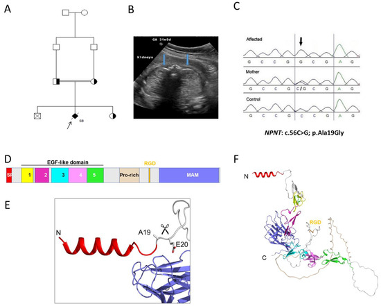 Family 2 with renal cystic dysplasia and NPNT variant. (A). Pedigree diagram of the studied family with cystic dysplasia with the proband arrowed. (B) Transverse view of the fetal abdomen at 31 weeks’ gestation, showing the fetal kidneys (blue arrows), which appear hyperechoic bilaterally. (C) Sanger sequencing chromatograms of the NPNT missense variant (NM_001033047.3:c.56C>G; p.Ala19Gly) in the proband, mother, and healthy control. (D) Domain structure of NPNT. NPNT contains an N-terminal signal peptide (SP), five EGF-like domains (Ca2+-binding by EGF-2, -4, and -5), compositional bias (Pro-rich), integrin interaction (RGD domain), meprin, A5/NRP1, and protein tyrosine phosphatase µ (MAM) domain 1. (E) AlphaFold2 predicted a three-dimensional structure of the N-terminal signal peptide domain. The SignalP 5.03–predicted cleavage site between Ala19 and Glu20 is indicated by the scissors. (F) Overall three-dimensional structure of NPNT predicted by AlphaFold2. Domains are colored as in D.