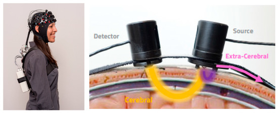 NIRSport2 device from NIRx as a small a backpack (left). NIRS source-detector placement (right). Photo courtesy: https://nirx.net/ (accessed on 30 March 2021).