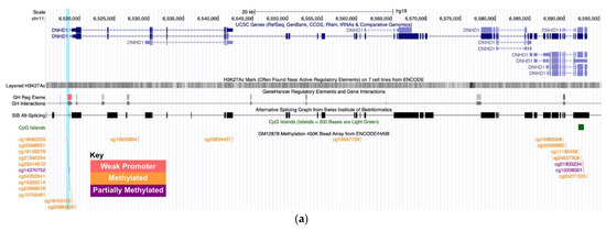 - Gomez, L.; Odom, G.J.; Young, J.I.; Martin, E.R.; Liu, L.; Chen, X.; Griswold, A.J.; Gao, Z.; Zhang, L.; Wang, L. coMethDMR: Accurate identification of co-methylated and differentially methylated regions in epigenome-wide association studies with continuous phenotypes. Nucleic Acids Res. 2019, 47, e98. [Google Scholar] [CrossRef]