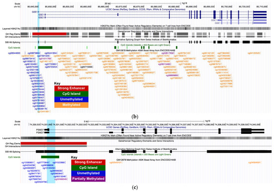 Biological features near (a) DNHD1, (b) GSE1, and (c) PSMD7 from ENCODE. Highlighted fragments correspond to the DMR position.