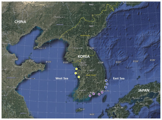 Locations of N. phocaenoides samples. E, East Sea (blue circle); S, South Sea (purple circle); W, West Sea (yellow circle).