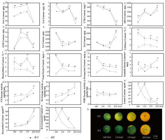 The trend of metabolites at different stages of fruit development in MT and WT. (A–G), Content of endogenous hormones during the four development and ripening stage, 100, 130 175 and 205 days after flowering, respectively. (H–L), Content of the peel structural material. (M–O), Activity of the related enzymes of peel structural material. (P–R), Content of pigment accumulation in citrus peel. (S), Different development and ripening stages of MT and WT. * and ** indicate significant differences at p < 0.05 and p < 0.01 levels, respectively, between WT and MT at a particular ripening stage based on Student’s t-test.