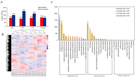 Analysis of transcriptome sequencing. (A) Numbers of DEGs between MT and WT at 100, 130, 175, and 205 DAF. (B) Cluster heatmap based on different samples of different genes. Red represents up-regulation, and blue represents downregulation. (C) GO Functional classification in MT and WT.