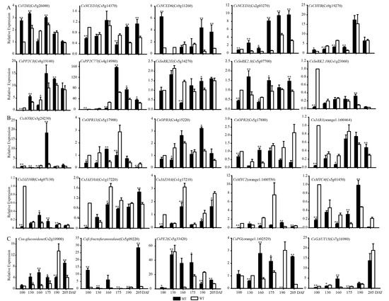 The fruit of MT is easy to peel compared with WT fruit, so we also found that 15 genes were involved in the starch and sucrose metabolism pathways, such as PG (orange1.1t02530 and orange1.1t02529), which were upregulated significantly, and the majority of SPS (Cs7g05690, orange1.1t03668, Cs4g05380, and Cs5g19060) genes were upregulated in MT, but PEs (Cs4g06710, Cs5g33420, and Cs2g17070) displayed a mixed expression pattern.