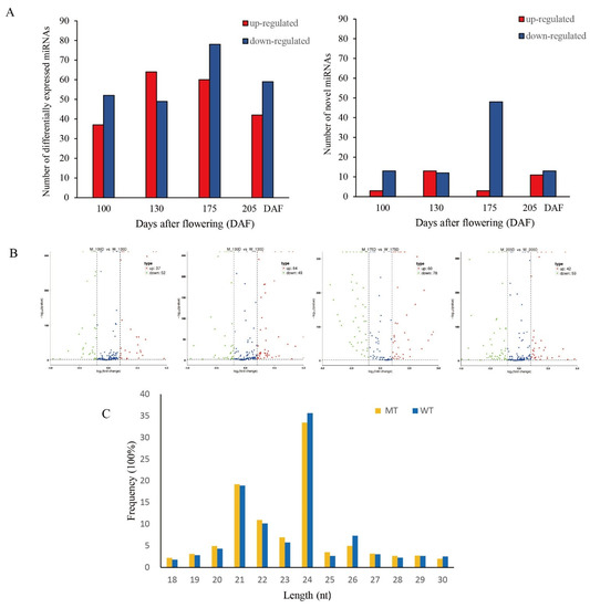Overview and analysis of miRNAs sequencing. (A) Number of differentially expressed miRNAs between MT and WT at 100, 130, 175, and 205 DAF. (B) The volcano map based on different samples of different miRNAs. Red represents up-regulation, and green represents downregulation. (C) Length distribution of the sRNA reads in MT and WT.