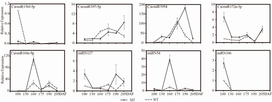 According to the sRNA-Seq results, we analyzed the expression patterns of eight miRNAs (five known miRNAs and three novel miRNAs) at six developmental periods (100, 130, 160, 175, 190, and 205 DAF). The results showed that the expression pattern of miR156 was similar between the two varieties and that the expression levels were low. The expression pattern of miR397 in WT was upregulated first during the development of WT fruit and then decreased, and it reached the highest expression level at 175 DAF. Compared with WT, the expression level of MT increased slowly during the early stage of fruit development and rapidly increased in the mature stage. In MT and WT, miR3954 and miR172 shared a similar pattern, both first increasing and then declining; the maximum level of miR3954 in MT appeared at 190 DAF and in WT at 175 DAF. The highest expression level of miR160 in MT was four times that in WT at 160 DAF. The expression pattern of miRN127 in MT was opposite to that in WT; the level of miRN127 was the highest at 100 DAF and 190 DAF in MT and showed a down-up-down pattern, while the lowest level in WT was at 190 DAF. The expression levels of miRN127 in other stages were lower than those in MT except for at 175 DAF. miRN54 was present at lower levels in MT and WT, but it was eight times higher in MT than in WT at 160 DAF.
