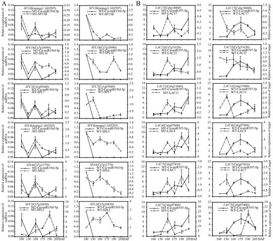 To verify the regulatory functions of miRNAs, we performed qRT-PCR analysis on the selected target genes of eight candidate miRNAs involved in fruit development, as shown in Figure 7. The quantitative analysis of 29 target genes showed that the expression patterns of most target genes were different in MT and WT (Figure 8 and Figure 9), but eight target genes showed similar expression patterns, including SP13B (orange1.1T02597), SPL9 (orange1.1T02265), SPL2 (Cs7g10830), PP323 (orange1.1T03355) and HSR4 (Cs1g19320). Most of the target genes were negatively regulated by miRNAs; for example, miR156f negatively regulated the SPL gene, and NAC genes were negatively regulated by miR3954. The results described above indicated that miRNAs regulated target genes, namely, transcription factors, which affected fruit development and ripening.