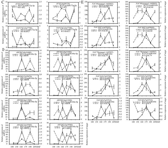 Expression patterns of known miRNAs and their target genes in MT and WT involved in fruit development and ripening. (A), csi-miR156f; (B), csi-miR397; (C), csi-miR172; (D), csi-miR160; (E), csi-miR3954.