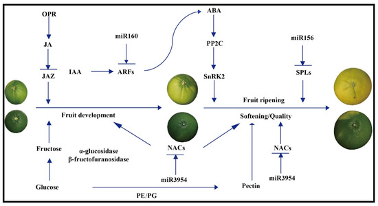 A schematic model with the proposed roles of transcription factors and miRNAs involved in citrus fruit development and ripening.