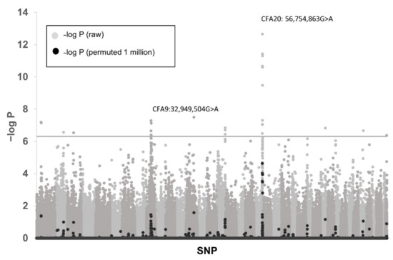 Manhattan plot of genome-wide association with 45 CA affected kelpies and 290 controls. Negative log of raw CHI-squared probabilities is shown in grey, and permuted (1 million permutations) values are shown in black. The most significant associations were identified on CFA20 and CFA9 corresponding with two different disease phenotypes in the data. The notional cut-off for significance (Praw) is indicated by a grey line (−log P = 6.3).