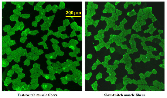 Vastus lateralis samples were obtained from the left leg using the modified Bergström needle procedure with aspiration under local anaesthesia using 2% lidocaine solution. Prior to analysis, samples were frozen in liquid nitrogen and stored at −80 °C. Serial cross-sections (7 μm) were obtained from frozen samples using an ultratom (Leica Microsystems, Wetzlar, Germany). Sections were thaw-mounted on Polysine glass slides, maintained at room temperature (RT) for 15 min and incubated in PBS (3 × 5 min). The sections were then incubated at RT in primary antibodies against slow or fast isoforms of the myosin heavy chains (M8421, 1:5000; M4276; 1:600, respectively; Sigma-Aldrich, Burlington, MA, USA) for 1 h and incubated in PBS (3 × 5 min). Afterwards, the sections were incubated at RT in secondary antibodies conjugated with FITC (F0257; 1:100; Sigma-Aldrich) for 1 h. The antibodies were removed, and the sections washed in PBS (3 × 5 min), placed in mounting media and covered with a cover slip. Images were captured with a fluorescent microscope (Eclipse Ti-U, Nikon, Tokyo, Japan). All analysed images contained 328 ± 12 fibers. The ratio of the number of stained fibers to the total fiber number was calculated. Fibers stained in serial sections with antibodies against slow and fast isoforms were considered hybrid fibers (Figure 1). The cross-sectional areas (CSAs) of fast- and slow-twitch muscle fibers were evaluated using ImageJ software (NIH, Bethesda, MD, USA).
