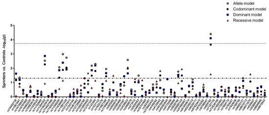 Genetic association tests of single-nucleotide polymorphisms (SNPs) related to self-reported walking pace between elite sprinters and ethnically matched controls. The y-axis represents the negative log10-transformed p-values of each of the evaluated genetic models, and the x-axis indicates the SNPs, according to the reference SNP ID numbers (rs nos.). The dashed line represents the significance threshold for nominal associations (p < 0.05), and the dotted line represents the significance threshold adjusted for multiple comparisons (p < 0.00018).