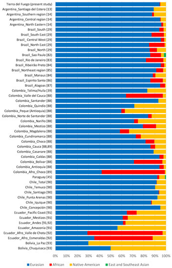Although Eurasian ancestry prevails in most admixed populations from Latin America [13,14,29,39,45,82,83,84,85,86,87,88,89,90,91,92,93], the studied sample of the current population of Tierra del Fuego is among those reported with the highest proportions (Figure 2).