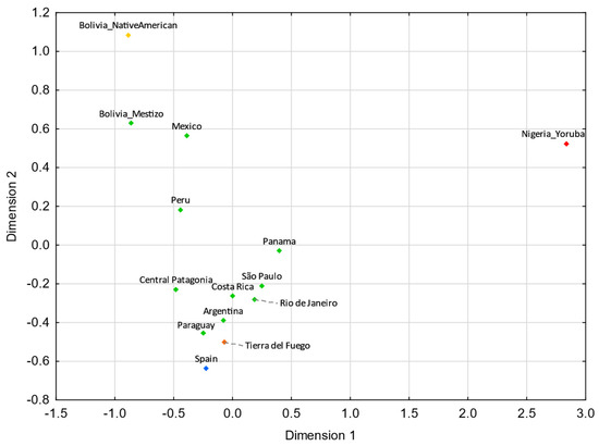 For both MDS plots (Figure 3 and Figure 4) generated from the pairwise genetic distances calculations, most of the admixed populations, including Tierra del Fuego, tend to cluster together and plot near to the Spanish population, evidencing a higher proportion of Eurasian male lineages than Native American and African ones. Furthermore, the male lineages from the admixed Bolivian, Peruvian, and Mexican populations seem to be less affected by the Eurasian gene flow to the Americas, as already addressed in other studies [15,40,97,98], having shorter genetic distances to the native population compared to the other admixed populations under analysis.