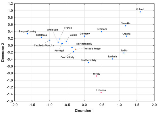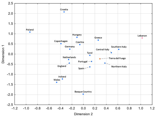 MDS plot based on RST genetic distances between Tierra del Fuego and European and Middle Eastern populations [43,99,106], based on 21 Y-STRs common to all studies and considering only European and Middle Eastern lineages from Tierra del Fuego (stress = 0.0596). Tierra del Fuego is plotted in orange, and the European and Middle Eastern populations are shown in blue and pink, respectively.