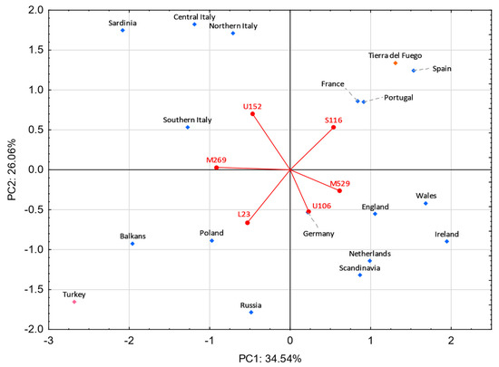 A PC analysis was performed to inquire which sub-haplogroups have the most weight in the differentiation of Tierra del Fuego, European, and Middle Eastern populations (Figure 7). In the lower right quadrant, the Celtic- and Germanic-speaking populations are observed. The Celtic-speaking populations are dominated by the haplogroup R-M529, while the Germanic ones, although some feature the haplogroup R-M529 in moderate frequencies, exhibit higher frequencies on haplogroup R-U106. Slavic-speaking countries and Turkey display high frequencies of haplogroups R-M269* (except Russia) and R-L23*. Moreover, Poland and Russia show significant frequencies of the subtype R-U106. In the upper left quadrant are the four Italian populations, all of which exhibit high frequencies for the subtype R-U152 and moderate ones for the subtype R-M269*. In the first quadrant are the population under study and the populations from Portugal, Spain, and France. All these populations present high frequencies for the sub-haplogroup R-S116*.