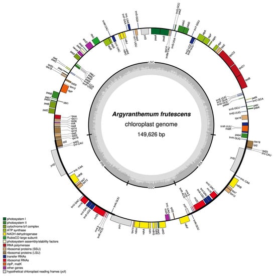Argyranthemum is the largest endemic genus of the Atlantic oceanic islands in Anthemideae (Compositae) [20,24]. Taxonomic treatments recognized Argyranthemum as congeneric with Chrysanthemum [25]. Bremer and Humphries [20] considered Argyranthemum, Chrysanthemum, Heteranthemis, and Ismelia as a monophyletic group and treated as the subtribe Chrysantheminae. Molecular phylogenetic analyses based on ITS and cpDNA data supported Argyranthemum as a separate genus [26,27]. Thus, the phylogenetic position of Argyranthemum in the tribe remains uncertain. To provide more useful genetic data for resolving the phylogenetic relationship of Argyranthemum in Anthemideae, the complete genome sequence is a reliable resource.